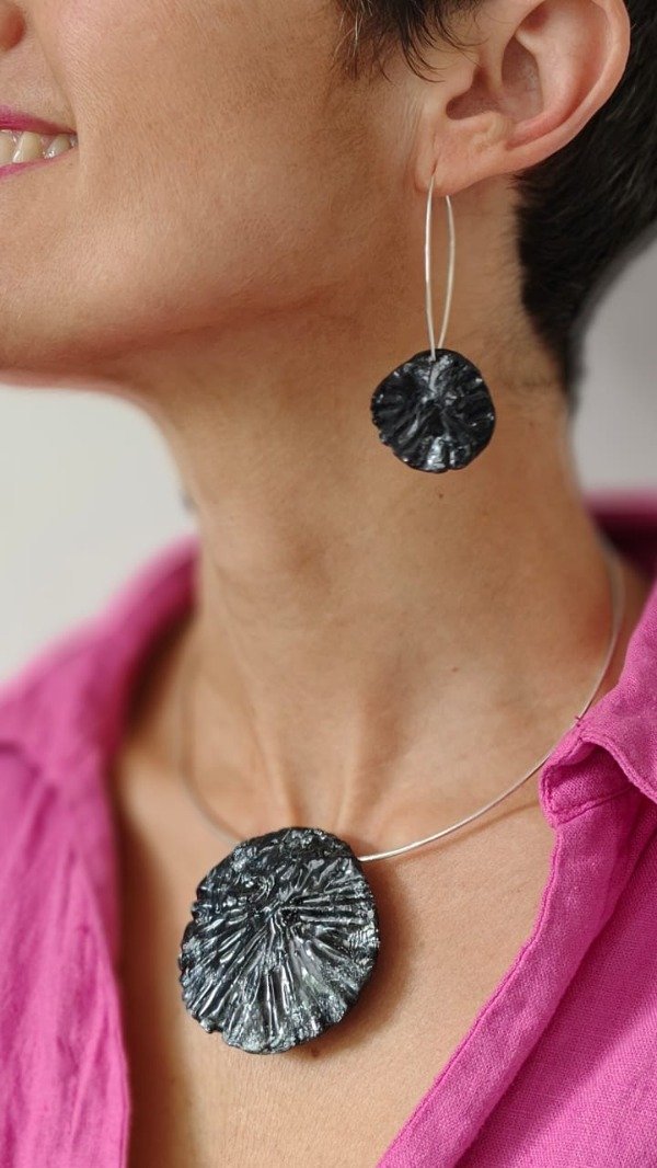 Set de aros y collar packaging hecho a base de materiales reciclados, listo para regalar o regalarte.